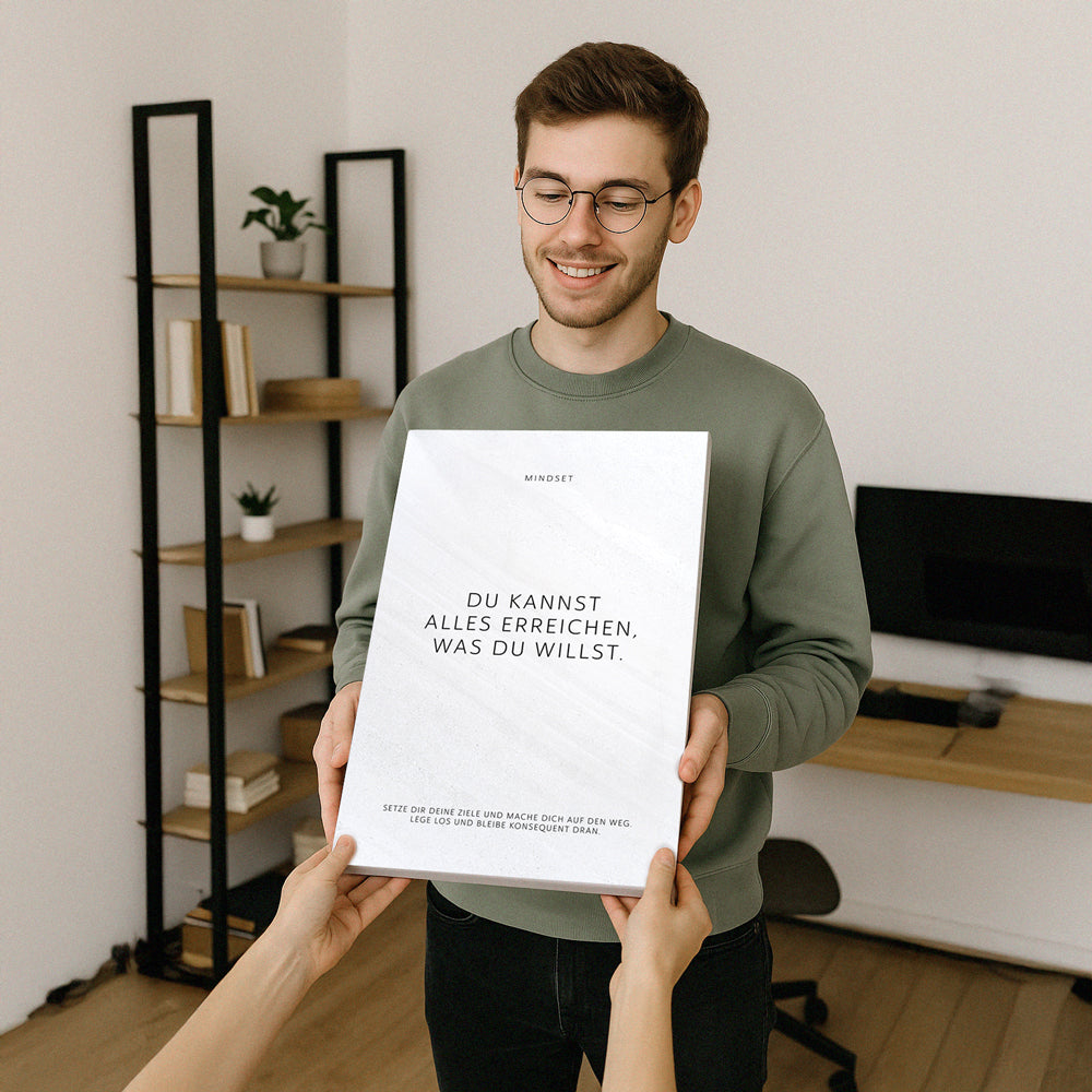 Besonders in Räumen im Skandi-, Industrial- oder Japandi-Stil entfalten sie ihre volle Stärke. Die Kombination aus Form, Typografie und Raum schafft ein bewusstes Gleichgewicht – stilvoll, reduziert und inspirierend. Motivationsbilder, die nicht dominieren, sondern fokussieren.